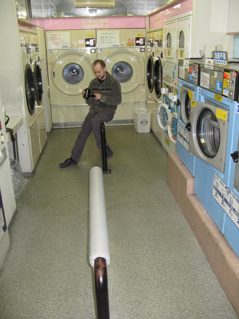 Итак автоматические раздвижные двери, которые впрочем в Японии встречаются повсеместно. Небольшое помещение у трех стен которого установлены в ряд и друг на друге стиральные машины с разной ёмкостью барабанов. У второй и третьей стены стоят сушилки. Загружаем машинку четырьмя комплектами кимоно, кидаем в монетоприемник 600 йен и на пол часа свободны, пока машина выстирает белье. В виду того что помещение по японски мало, стульев для ожидающих нет. Зато прямо посередине помещения установлены поручни, почти как перила, обернутые мягкой тканью. Это специальные жердочки для ожидания. Прислонился к ней или сел и смотри телевизор, которых аж 2 штуки. Этим мы и занялись. По телеку идут какие то супер шоу с Галкиными, Петросянами местного разлива. То они мыльные пузыри выдувают с помощью разных вещей от дужек для очков, до рваных кедов, то мажут друг друга какими-то гадостными на вид субстанциями. В общем, вокруг царит атмосфера праздника, периодически прерываемая рекламными роликами где розовые и пушистые барби с покемонами едеят шоколад или пьют Джапан-Колу. Выстирались, перекинули мокрые вещи в сушилку, зарядили деньгами и еще 20 минут дышим воздухом. Погода надо сказать тут переменчивая, утром было солнышко, а сейчас снова пасмурно, но тепло как летом. Зашли в стоящий рядом магазин, купили себе перекус. Я взял связку из четырех бананов за 400 йен, местное мороженное и овощной сок. Юра какую-то желтую сферическую штукенцию непонятного свойства снаружи сладкое тесто а внутри мясная начинка, Димка яблоки. Решили провести контрольное фотографирование Юры, вдруг не выживет после этого пончика.