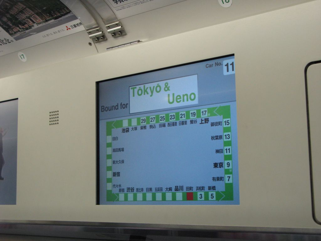 Выходной турникет его просто скушает и не останется никакого мусора после вас. В самом метро люди двигаются как муравьи размеренно придерживаясь левой стороны. На перронах ожидают поезда выстраиваясь в короткие очереди напротив отмеченных на полу мест где будут размещаться двери прибывшего поезда. Заходят не торопясь и без суеты. Машинист поезда после остановки и открытия дверей выходит из кабины и смотрит вдоль состава, ожидая пока все люди зайдут, а не давит их дверями с воплями «Посадка окончена, не держите двери!». Вагоны шире чем в московском метро и оборудованы ремнями-поручнями повсеместно висящими с потолка. Кстати, для нашего роста не очень удобна высота ремней. Эти ремни задевают голову, когда вы двигаетесь по вагону или стоите под ними. Над сидячими местами оборудованы полки для багажа, так что вам не придется изнывать под тяжестью мешка с картошкой с дачи, его можно закинуть на полку. Слава японским инженерам высота позволяет класть и доставать с полок вещи свободно не подпрыгивая. Над дверями расположены большие информационные экраны на которых показывается название следующей станции, указываются двери которые будут открываться (слева или справа). Информация показывается поочередно на японском и английском языках и дублируется голосом, так что проехать свою станцию практически невозможно.